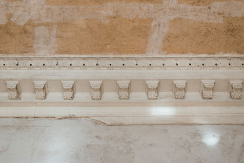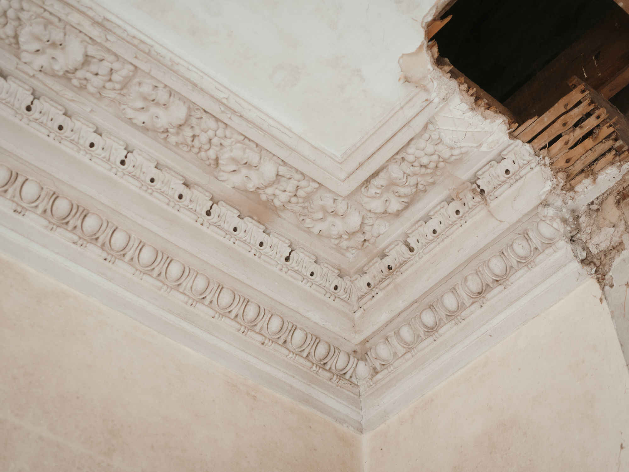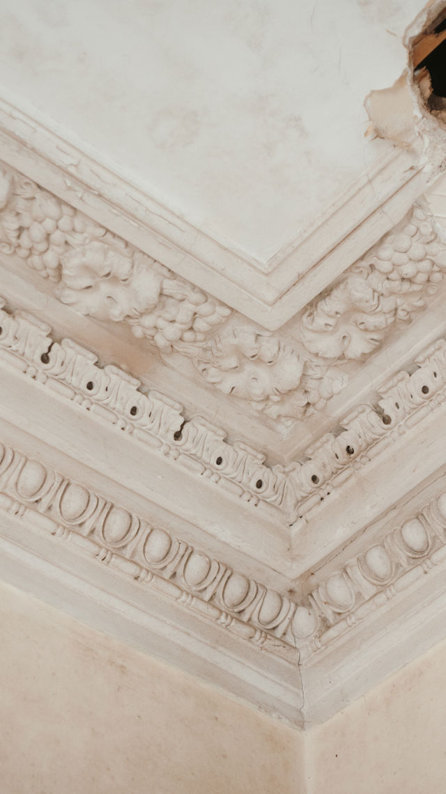 There are several ways to reinstate the rotten cornices. They can be recreated in the traditional manner using sectional plaster moulds, or, more cost-effectively, formed in fibreglass or, in some cases, high-density foam that can be plastered over or painted.